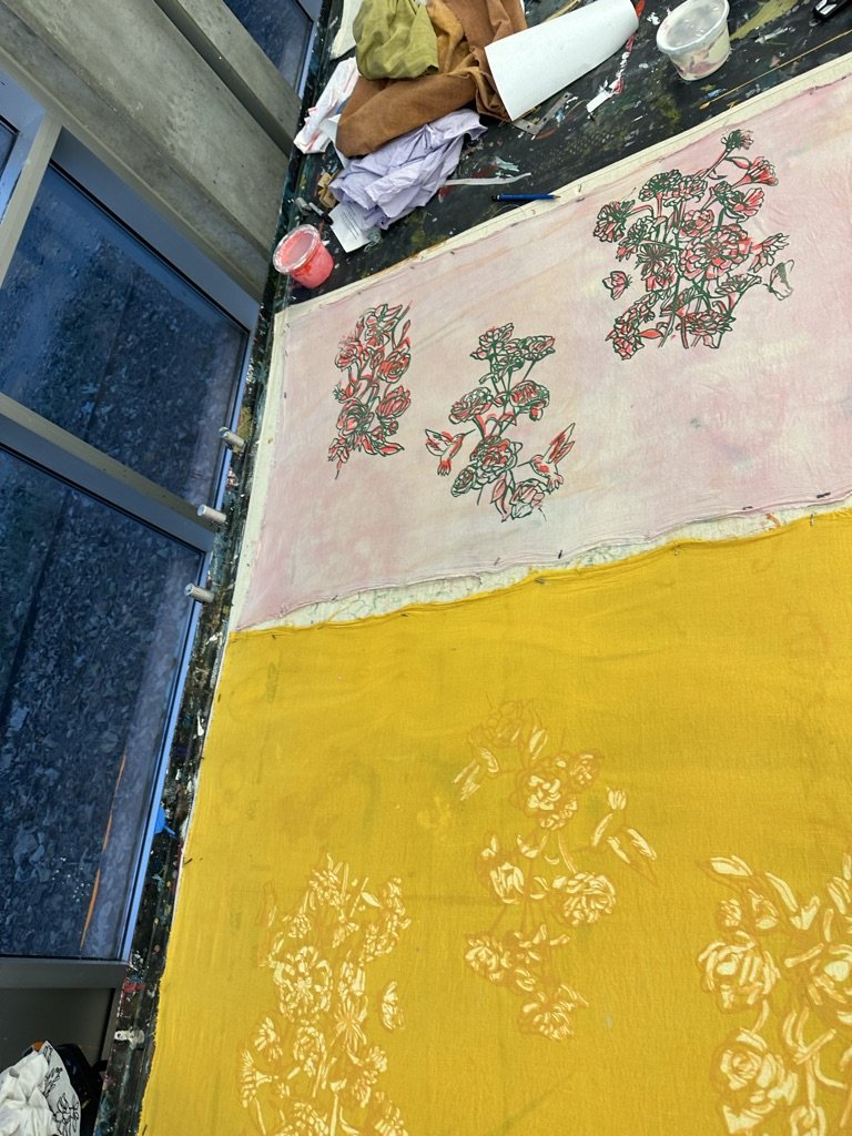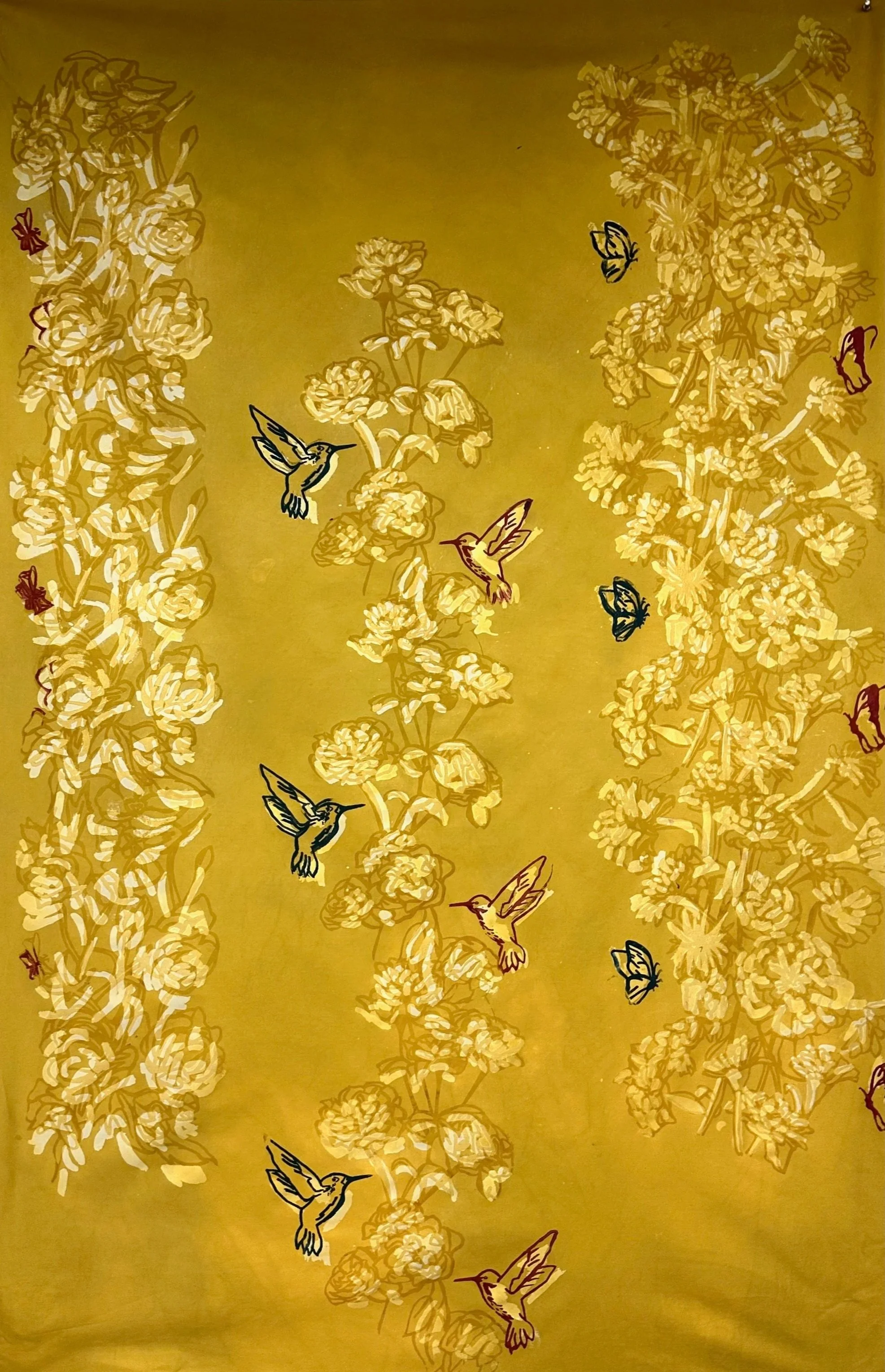 Inspired by the interiors of the live-action Cinderella movie, this piece combines ranunculus, zinnias, and primrose to form a series of stripes. The first screen layer, applied with paint, creates a painterly texture that contrasts with the whimsical linework of the second screen.
