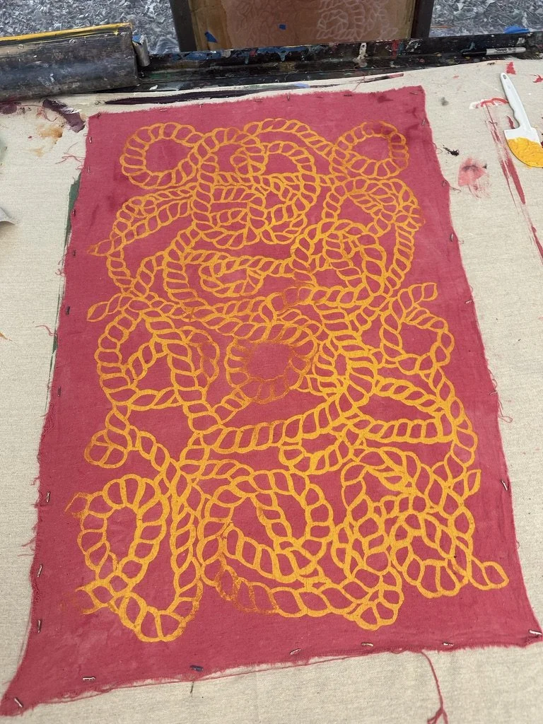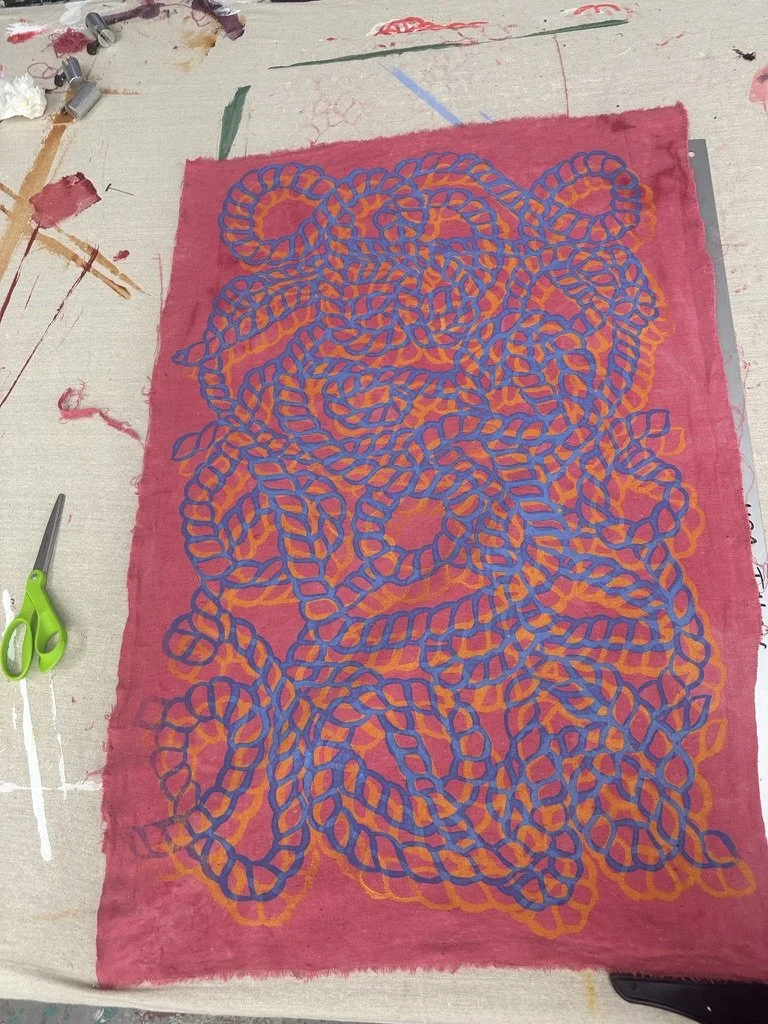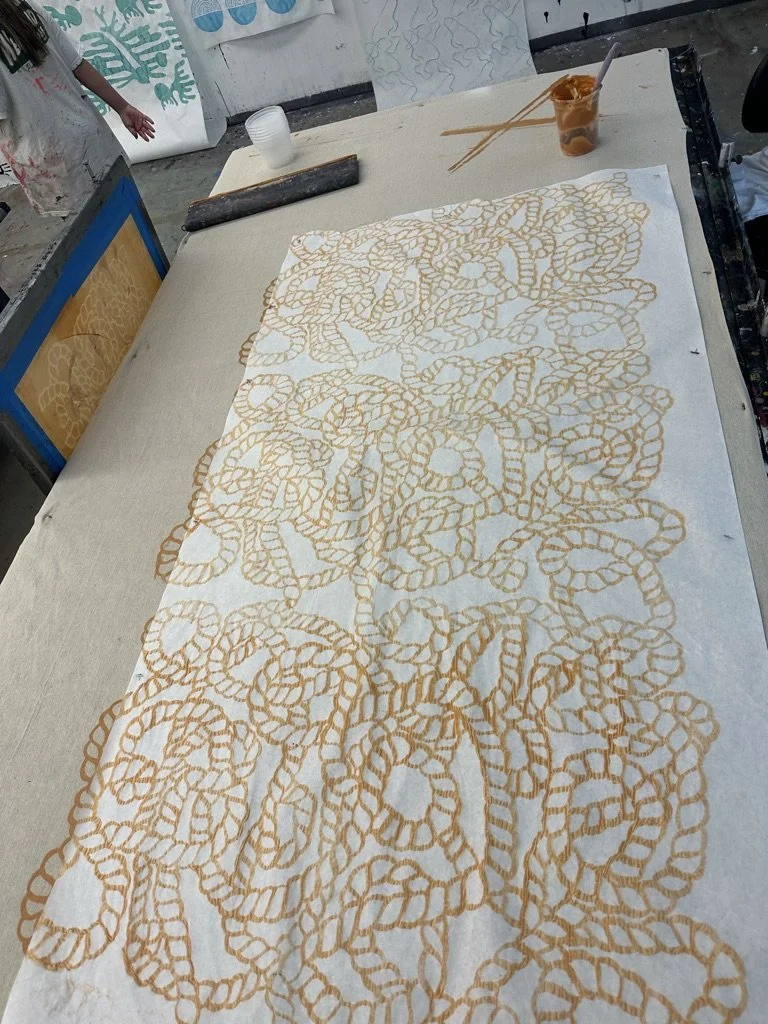 The tactile process of designing screen prints has given me a deep respect for the translation of ideas into reality. Every screen print I have created begins with a hand-drawn motif and repeat, grounding my work in craftsmanship. This process informed the designs I created for Coco Shop, a brand that originally relied solely on screen printing. My passion and aptitude for the medium led to my selection by the Chair of the Fabric Design program to assist in teaching the beginner-level class in Fall 2025.